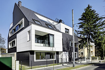 Durch die differenzierte Fassadengestaltung sind die einzelnen Wohneinheiten von außen gut ablesbar. Auch die für diese Gegend typische dunkle Holzschindelfassade wird zitiert und mit kleinformatigen, anthrazitfarbenen Faserzementplatten in einen modernen Werkstoff übertragen. Diese Gebäudehülle zieht sich durchgängig über alle Wandflächen der Hauptkubatur und weiter bis über das Dach. Für eine homogene Gesamtwirkung wurde die Dachentwässerung über innenliegende Rohre geführt. Die klassische Gebäudeform mit Satteldach bietet auch beim Neubau den Vorteil, den Raum auf allen Ebenen optimal nutzen zu können.