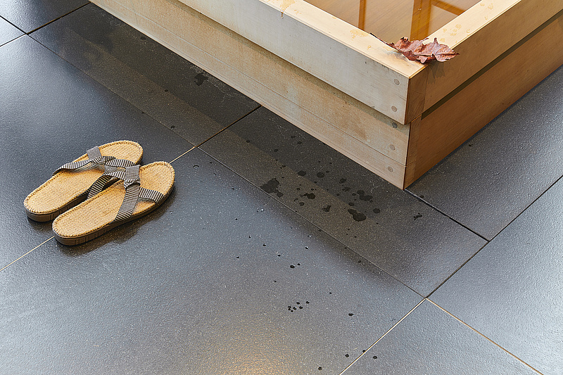 Als Liebhaber der japanischen Kultur wünschten die Auftraggeber auch in ihrem Privathaus die Möglichkeit für diese Lebensart. Im Erdgeschoß schufen sie einen zum Wald hin offenen Raum, einen Ofuro, der die einzelnen Stadien des traditionellen japanischen Baderitus zur Entspannung am Ende eines Tages erlaubt. Dieser beginnt mit der gründlichen Körperreinigung unter einer Dusche oder im Sitzen mit Holzkübel und Schwamm. Den Abschluss bildet die Entspannung in heißem Wasser in der traditionellen, kastenförmigen Holzwanne aus unbehandeltem, japanischem Zypressenholz. In Form und Funktion unterscheidet sich ein japanisches Bad wesentlich von der westlichen Weise, ein Bad zu nutzen. Diese Besonderheiten bildet das mit dunkelgrauem, seidenmatt gebürstetem Nero Assoluto gestaltete Bad ab. Die kraftvolle Raumwirkung wird durch die großformatigen, quadratischen Platten am Boden und an den Wänden und dem daraus resultierenden niedrigen Fugenanteil betont. So reduziert und zurückhaltend die Gestaltung auf den ersten Blick scheint, so raffiniert ist die technische Umsetzung. Dies zeigt sich nicht zuletzt in der Konstruktion des Bodens. Ein Ofuro ist in der Regel als Nasszelle angelegt, in der das Wasser überall fließen kann und durch Abflüsse im Boden abgeleitet wird. Aus diesem Grund liegen die Bodenplatten rings um die Holzwanne lose auf und lassen überschüssiges Wasser über eine versteckte Drainage ablaufen.