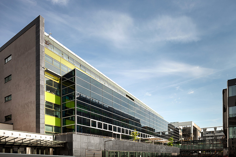Umgeben ist das nach Plänen von Architekt Boris Podrecca errichtete Zentrum mit einer Bruttogeschoßfläche von rund 20.000 Quadratmetern von einer Basalt- und Glas-Hülle. Laubengänge, ein Gewächshaus mit dreigeschoßiger Glasfassade als Klimapuffer für die Labors sowie verglaste Besprechungsboxen, die in den Luftraum ragen, um den die Hörsäle, Seminarräume und Büros angeordnet sind, verleihen dem Gebäude eine transparente Eleganz, bereiten aber auch Probleme. Denn hinter dem einfachverglasten Glasvorbau der Südfassade heizten sich die Räume im Sommer derartig auf, dass ein konzentriertes Arbeiten unmöglich wurde. Eine Möglichkeit zur Verschattung gab es nicht, im Winter bot die Einfachverglasung wiederum kaum Wärmeschutz. So wurde es 2015 Zeit für eine energetische Fassadensanierung. Ziel war es dabei, das gläserne Atrium und damit den Blick nach draußen zu erhalten. Geplant wurde der Umbau von ATP