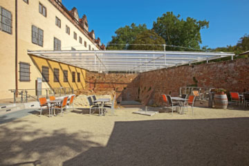 Grabungen im Kloster von Wittenberg haben Reste von Luthers alter Studierstube zu Tage gebracht, die als Geburtsort des Protestantismus weltweit bekannt geworden ist. Statt eines provisorischen Daches wollte man eine dauerhafte Lösung finden. Die Wiener Architekten Silja Tillner und Alfred Willinger konnten sich in einem Realisierungswettbewerb mit einem transparenten Folienkissendach als Sieger behaupten. Ihr Entwurf ist ein möglichst minimaler, aber zugleich ästhetisch hochwertiger Eingriff in die denkmalgeschützte Anlage. Die in Aluminiumrahmen gehaltenen Folienkissen weisen einen hohen Transparenzgrad auf bei zugleich geringem Gewicht. So überzeugt der Entwurf mit einer zarten Stahlkonstruktion und einer zurückhaltenden architektonischen Form.