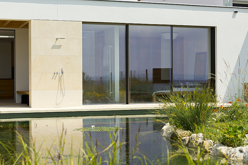 Um die Verschmelzung vom Hausinneren mit dem Außenraum zu betonen, wählte der Architekt einen einheitlichen Bodenbelag. Der warme Beigeton des Natursteins schafft eine durchgehende Basis: Im Inneren sind die Oberflächen der St. Margarethener Bodenplatten geschliffen, die auf einem Drainagemörtelbett verlegten Bodenplatten der Terrasse und Freiflächen sind diamantgesägt. Durch das Sägen erhält der bereits seit der Römerzeit begehrte Naturstein eine leicht aufgeraute, trittsichere Oberfläche, die gleichzeitig die feine Struktur des Sedimentgesteins mit den darin eingebetteten Fossilienresten zur Geltung bringt. Auch für die Fassadenbekleidung wurde St. Margarethener großformatig eingesetzt. Die Fertigung ab Rohblock erlaubt individuelle Formate, die sich den gestalterischen Vorgaben der Bauherren anpassen lassen und eine präzise Planung des Fugenbildes erlauben. Ein Beispiel dafür sind die Wangen der Treppe, deren einzelne Platten exakt die Breite der Trittstufen aufweisen.