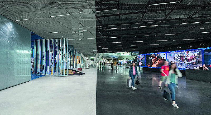 Erschlossen wird das Gebäude von einer weit gespannten, skulpturalen Stiegenhausanlage im Foyer. Durch die große helle Lichtöffnung im Dach leitet sie die Mitarbeiter in die luftige Höhe der dreigeschoßigen Arbeitswelt und eröffnet den Blick ins Foyer. Die drei Obergeschoße mit hochmodernen Arbeitsplätzen in flexibler Grundrissstruktur ruhen über dem Gelände auf 67 V-förmig angeordneten, mit Beton verfüllten Stahlrohrmantelstützen, die das Tragwerk aussteifen. Das in einer Gartenanlage eingebettete Erdgeschoß bildet zugleich den Zugang zur „World of Sports“.
