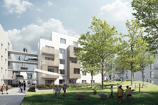 Architekt Christoph Treberspurg erwähnt weitere ganzheitliche Planungsziele: „Die Baukörper wurden gezielt so gesetzt, um sommerlicher Überhitzung vorzubeugen.“ Prädiktive Bauteilaktivierung sorgt hier mit der Koppelung mit Windenergiegewinnung für besondere Umstände. Energie wird je nach erwartbarem Wind und Wetter in die Gebäudemasse übertragen.