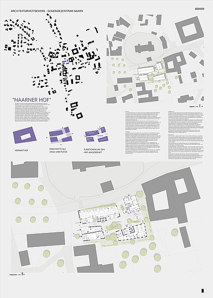 Gewonnen hat den Wettbewerb der Linzer Architekt Gerald Anton Steiner. Sein städtebauliches Konzept greift die für Naarn typischen Bauformen von Vierkanter und die um einen „Weiler“ gruppierten Höfe auf und überlagert den kompakten Vierkanter mit einer offen gruppierten Siedlungsform. Das neue Gemeindeamt wird folgerichtig entlang der Hauptstraße als lang gestreckter