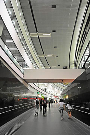 Über künstlich beleuchtete Gänge geht es weiter, ehe eine Rampe den Blick in den Raum freigibt. Fast wäre man an der Hinweistafel mit den Fluglinien vorbeimarschiert samt den in den Wänden integrierten Bildschirmen, die den Terminal und das Gate angeben. Über eine schmale Rolltreppe kommt man ins Obergeschoß, wo sich an den Self-Check-Ins Menschentrauben ballen. Ist die Bordkarte erst einmal ausgedruckt, muss man durch die Sicherheitsschleusen – serpentinenförmig abgesteckte Wege leiten zu den Durchleuchtungsstellen. Eine gefühlte Ewigkeit, ohne zu wissen wie lange genau – denn Uhren sieht man nicht. Der bogenförmige Schwung des Terminals gibt die einzelnen Gates nur langsam preis, trotz beschleunigender Förderbänder. Am Ende sinkt man ermattet in den Wartesessel, das dunkle Ambiente trägt zur Müdigkeit bei.