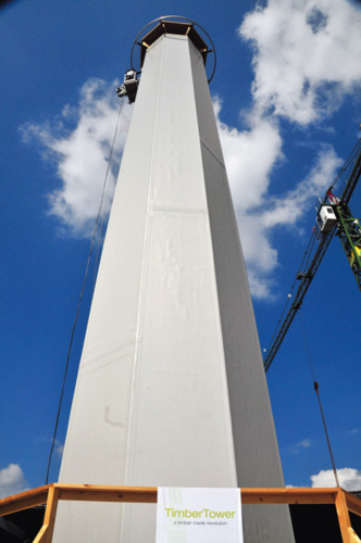 Das deutsche Unternehmen TimberTower baut nun als weltweit erstes Unternehmen Holztürme für große Windkraftanlagen der Multimegawatt-Klasse inklusive der Fundamente. Heuer wurde mit dem Bau des ersten, 100 Meter hohen TimberTowers in Hannover begonnen. Ein Holzturm spart bei dieser Turmhöhe ca. 300 Tonnen Stahlblech.