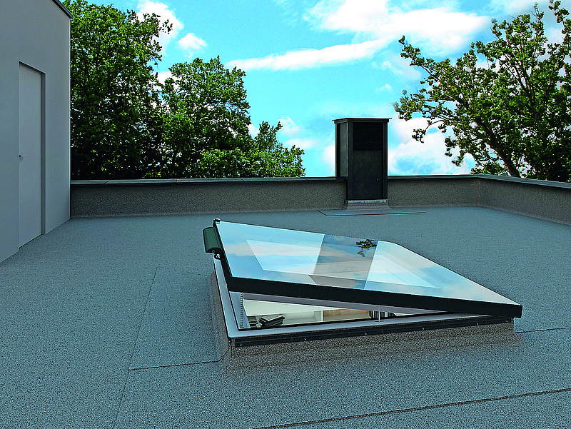 Es bezieht Strom aus einem kleinen Solarpaneel am Fensterrahmen. So spart man langfristig Kosten und ist 100 Prozent energieautark. Die Installation ist unabhängig von der Stromquelle möglich. Die herkömmliche Kuppel wurde durch eine flache, gehärtete und wärmeisolierte Glasscheibe ersetzt und kann harmonisch in die Gestaltung von Dachterrassen und Flachdächern ab einer Dachneigung von zwei Grad integriert werden. Gesteuert wird das Fenster mit dem Z-Wave SmartHome Funkstandard – per Fernbedienung, per Funk oder über Smartphone bzw. Tablet/Touchscreen. Ein Regensensor ist standardmäßig integriert.