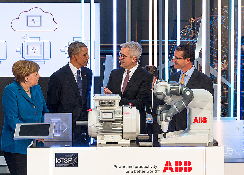 ABB CEO Ulrich Spiesshofer demonstrierte den beiden Regierungschefs am ABB-Stand wie dieser das Management von Millionen Elektromotoren durch die erstmals mögliche Verbindung mit Cloud-basierten Diensten verbessern kann. „Der Smart Sensor ermöglicht die transkontinentale industrielle Digitalisierung“, sagte Spiesshofer. „Der Sensor verringert Stillstandszeiten von Motoren um bis zu 70 Prozent, verlängert die Lebenszeit um etwa 30 Prozent und reduziert den Energieverbrauch um bis zu 10 Prozent. Wenn alle weltweit installierten industriellen elektrischen Motoren mit unserem Smart Sensor ausgerüstet würden, könnte die von 100 großen Kraftwerken erzeugte Energie gespart werden“.