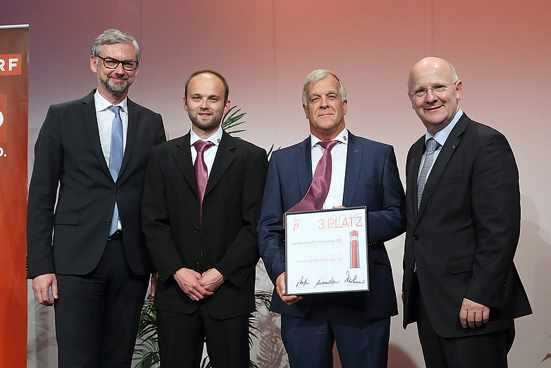 Eine Hochdruckpumpe mit Servoantrieb, die wesentlich weniger Strom verbraucht als herkömmliche Hochdruckpumpen – für diese wegweisende Entwicklung wurde die Perndorfer Maschinenbau KG aus Kallham am 19. Oktober von Wirtschaftslandesrat Michael Strugl mit dem 3. Platz beim OÖ. Landespreis für Innovation ausgezeichnet. Der Landespreis für Innovation 2016 wird vom Land Oberösterreich und der oö. Wirtschaftsagentur Business Upper Austria in Kooperation mit der WKO Oberösterreich (Sparte Industrie) und der Sparkasse OÖ vergeben.