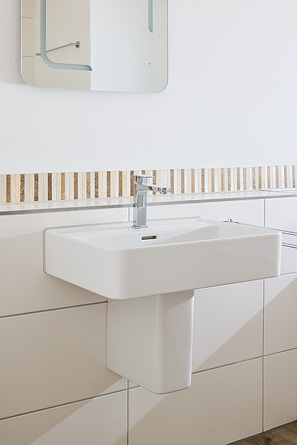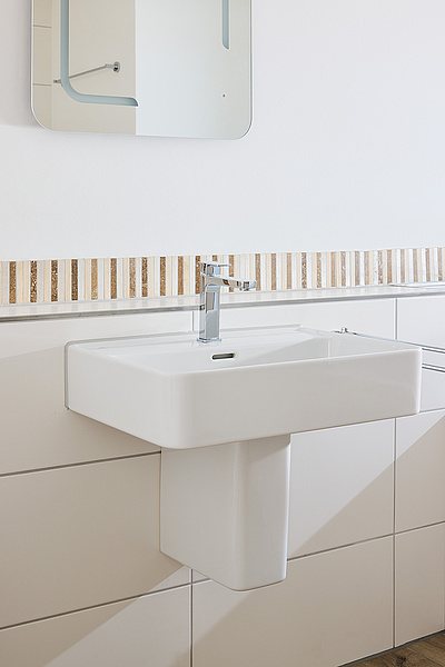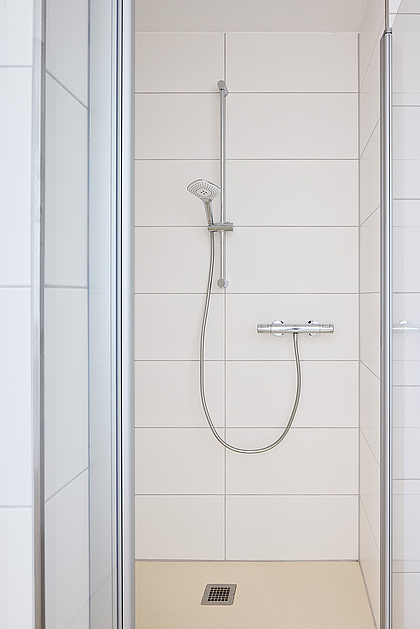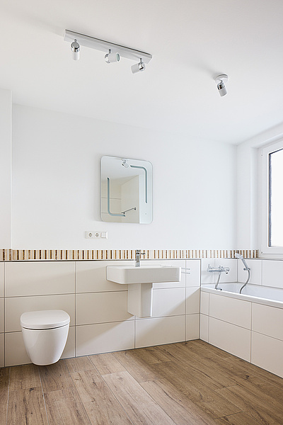 Die Wohnungen sind auch im Inneren bis hinein in die Bäder in Design und technischer Ausstattung weitgehend einheitlich gestaltet. Farblich herr-schen – wie im Außenbereich und bei Fassaden – Weiß, Sand- und Beige-töne vor. Die Böden mit Fußbodenheizung sind mit Vinylboden in Holzop-tik belegt. An dieses Design schließen sich die Bäder mit Bodenfliesen in Holzoptik an. Wände sind umlaufend verfliest und mit einer Edelstahlschiene und einem beigefarbenen Natursteinmo-saik verziert. Die Deckenbeleuchtung mit LED-Strahlern gehört ebenfalls zur Standardausstattung. Die Bäder von 50 Wohnungen sind jeweils mit Badewanne und Dusche bestückt. Nur bei zwei Wohnungen war dies aus baulichen Grün-den nicht möglich. „Auch damit wollen wir möglichst viele Optionen anbieten, die es leicht machen, sich für eine Wohnung zu entscheiden."