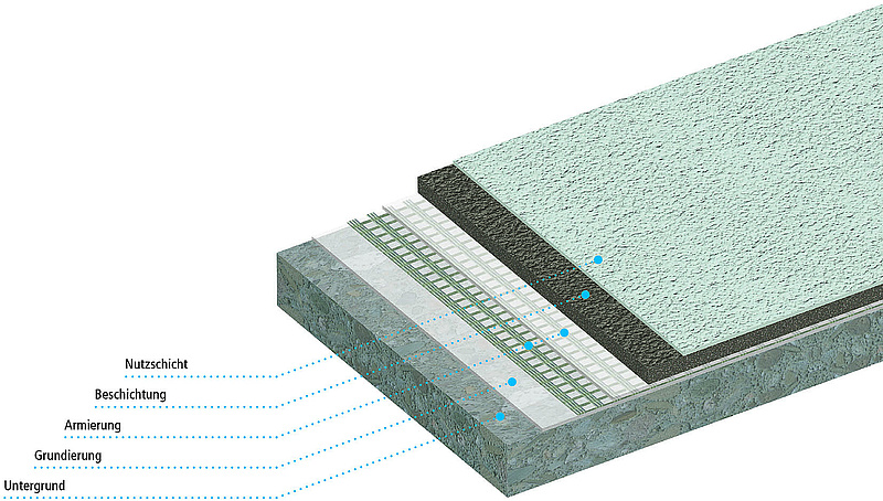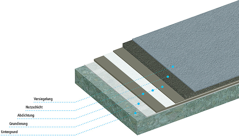 Längst sind es aber nicht nur die Fahrzeuge, unter denen die Bausubstanz über die Jahre leidet. Hinzu kommen chemische Belastungen durch UV-Sonnenlicht, Regen- und Tauwasser, Streusalz, Kraftstoffe und Öle. Diese greifen die Oberflächen an. Bestehen hier Schäden, können Feuchtigkeit und Chloride eindringen, was sich extrem negativ auf die Konstruktion auswirkt und sogar die Standsicherheit gefährden kann. Das sieht nicht nur ungepflegt aus, sondern beeinträchtigt auch die Betriebssicherheit. Dann gilt es, im Rahmen einer Instandsetzung eine dauerhafte Abdichtung zum Bauwerkschutz wiederherzustellen. Darüber hinaus bestehen an die Sanierung von Parkflächen zusätzliche Anforderungen, zum Beispiel in puncto Rutschfestigkeit und Brandschutz. Flüssigkunststoff-Produkte erfüllen diese und haben weitere Vorteile: Ihre lange Lebensdauer verlängert die Wartungsintervalle erheblich. Im Zusammenspiel mit nur kurzen Ausführungs- und Sperrzeiten steigert dies die Wirtschaftlichkeit.