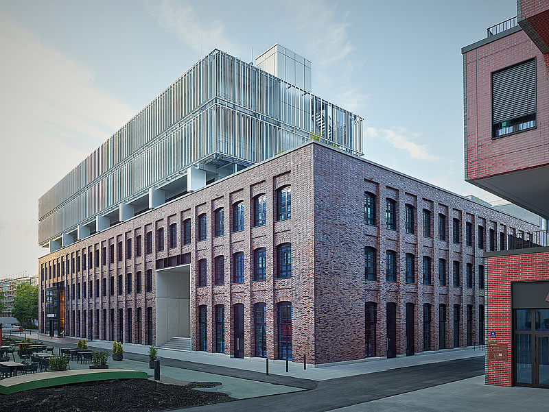 Heute kennzeichnen Dienstleistung, Digitalisierung und Design statt industrieller Produktion das Gebiet. Die „Macherei“ ist solch ein Schmelztiegel moderner Lebens- und Arbeitswelten. Die sechs individuell gestalteten Gebäude beherbergen Handel, Gastronomie, Hotel, ein Fitnessstudio sowie Loftbüros. Die in Stahlbeton ausgeführten Bauten werden größtenteils von Ziegelfassaden in unterschiedlichen Farbtönen geprägt. Am Gebäude M5 kamen dabei Klinkerriemchen von Gima im Format 240/15/71 Millimeter zum Einsatz, die direkt auf das Wärmedämmverbundsystem geklebt wurden. Durch ein spezielles Kohle-Salzbrandverfahren entstand hierfür eine projektspezifische Sortierung der Farbe Erbusco FKSG. Am Gebäude M6 wiederum wurde die Sortierung Breno FKSG im Format 240/115/52 Millimeter verwendet. Auch hier erhielt der Stein auf Basis eines roten, rustikal anmutenden Scherbens seine raue Struktur mit Verwerfungen in der Oberfläche. Eine Besonderheit des Projekts stellen die als Fertigteile im hauseigenen Werk vorfabrizierten Rundbögen über den Fenstern dar.